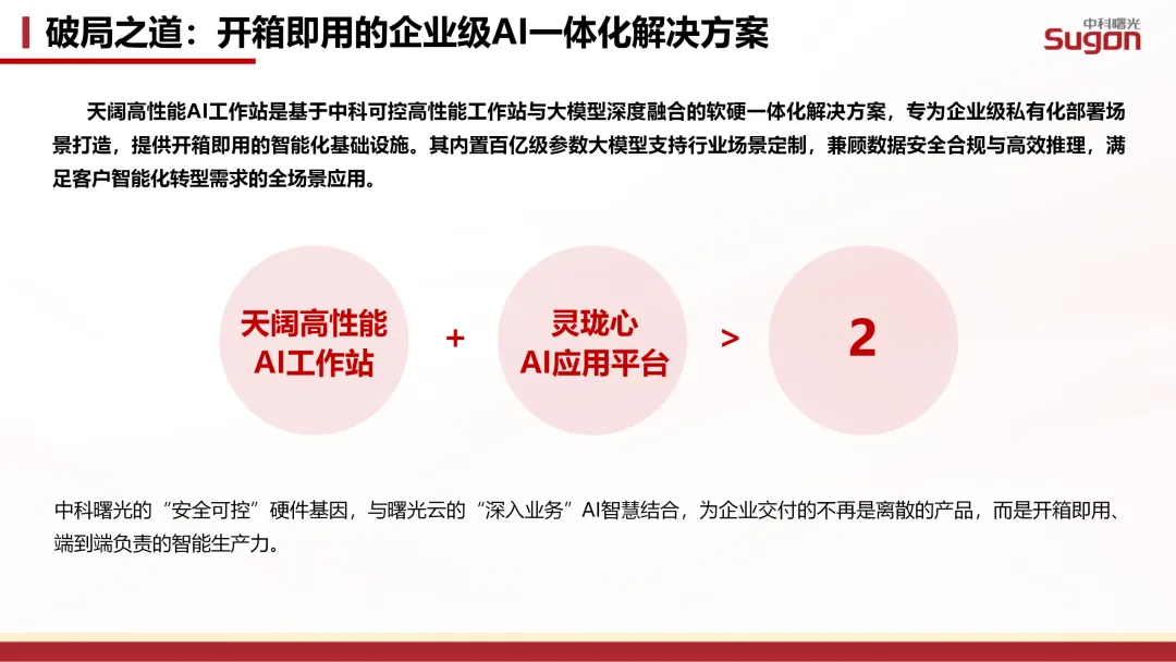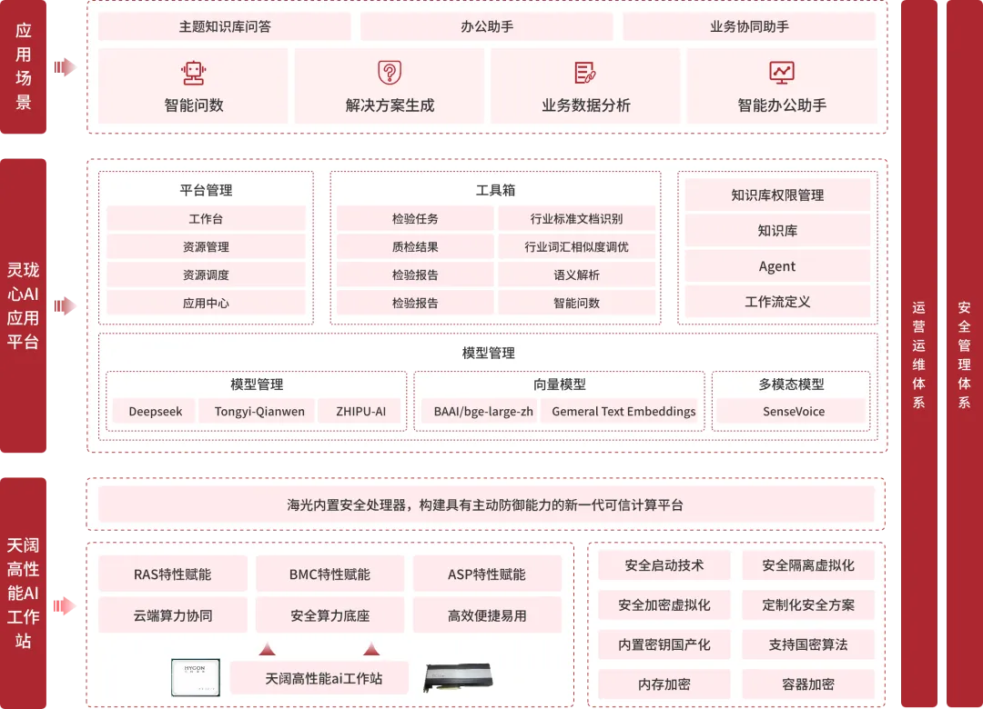 针对上述痛点,该方案以四大核心优势精准破解行业痛点:一是精准匹配,避免浪费。方案提供从中科曙光T40P到W50X的全系列工作站,企业可根据模型规模(7B至70B+参数)与并发需求精准选型;软硬一体交付模式,客户无需为复杂的集成与选型额外付费,让投资更聚焦于业务价值。二是开箱即用,快速上线。预装并完成调优的一体机实现“交付即用”,客户可快速通过“灵珑心”AI平台创建知识库或使用AI应用,将部署周期从“月”级缩短至“天”级;硬件与平台由同一生态伙伴提供,也彻底解决多厂商协调与售后难题。三是免运维,易使用。“灵珑心”平台提供图形化界面,业务人员无需代码基础即可快速上手,并内置源自行业实践的AI应用(如隐患排查报告助手、智能问数);企业无需组建庞大的专业AI团队,有效降低人力与技术门槛。四是全栈可信,自主可控。方案基于海光国产CPU和中科曙光安全硬件构建,从芯片根源保障供应链安全;支持完全私有化部署,确保数据在内网形成闭环;从硬件(海光CPU)、服务器(中科可控)、到操作系统(中科方德)、AI平台(灵珑心)均为国产自研,天然满足国家重点行业信创要求,采购路径清晰合规。