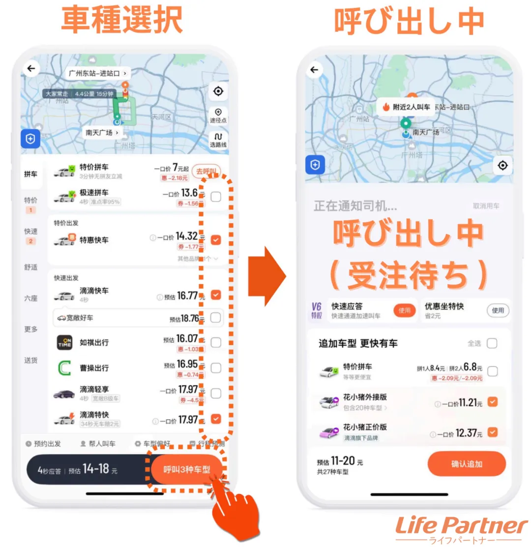 利用したい車種の右にあるチェックボックスにチェックを入れて下部にある「呼叫※种车型」をタップすれば呼び出し中の画面になります