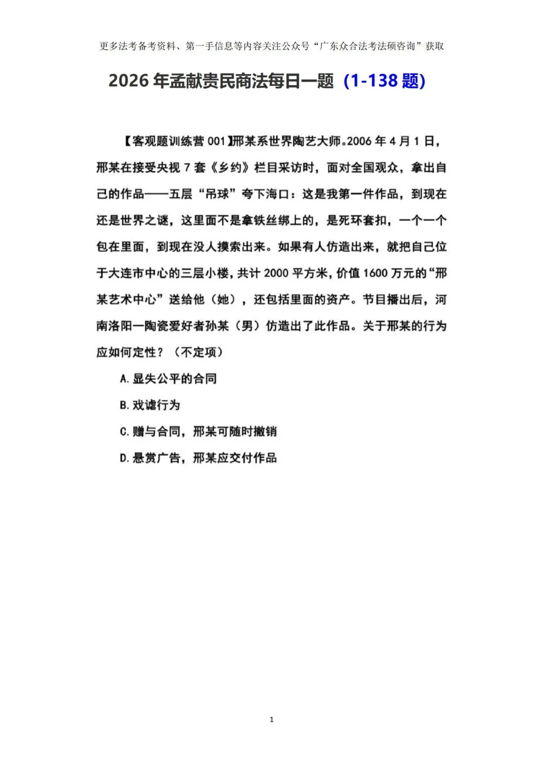 PDF打印版丨138题孟献贵2026届民商法每日一题汇总今天,给大家整理了孟献贵老师民商法每日一题(1-138题)备考干货的汇总。民商法每日一题添加微信留言回复“民商法每日一题”即可免费获取完整电子版资料ZHONGHE2026法考精品全程班八大技术流名师授课+配套讲义主客一体六轮十阶,备考闭环助力通关810+课时,11轮测试/模考,24h官网答疑👇 点击下方卡片,了解详情 👇