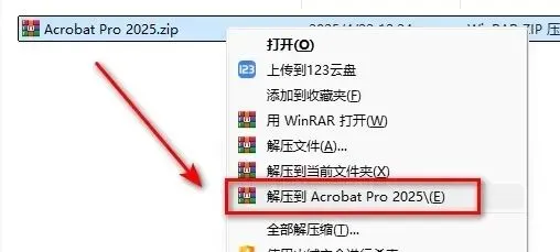1.鼠标右键解压到“Acrobat Pro 2025”,解压之前必须关闭杀毒软件,不然破解文件解压后文件夹显示为空。