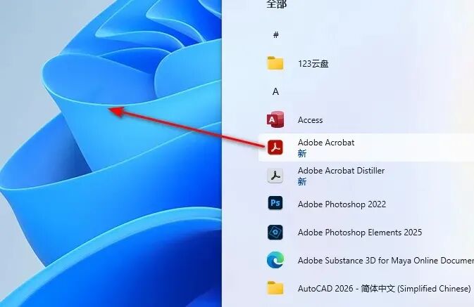 8.在开始菜单栏中找到“Adobe Acrobat”,拖动到桌面上即创建中文的快捷图标
