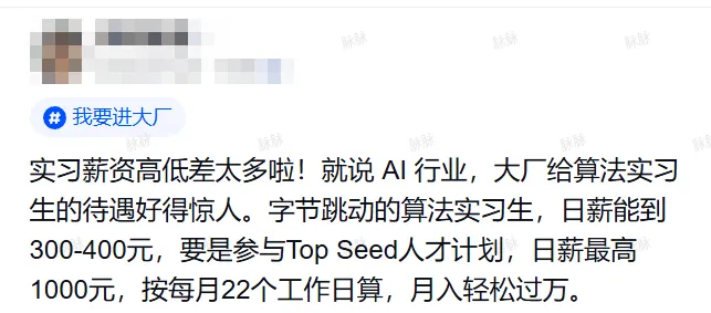 各大厂为了抢到优质人才不惜开出天价offer。字节跳动大模型算法年薪可达80万-220 万。就连实习生日薪都能冲到千元。