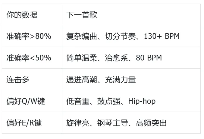 更有意思的,游戏会分析你的操作数据——准确率、反应速度、连击数、你更偏好按哪几个键——