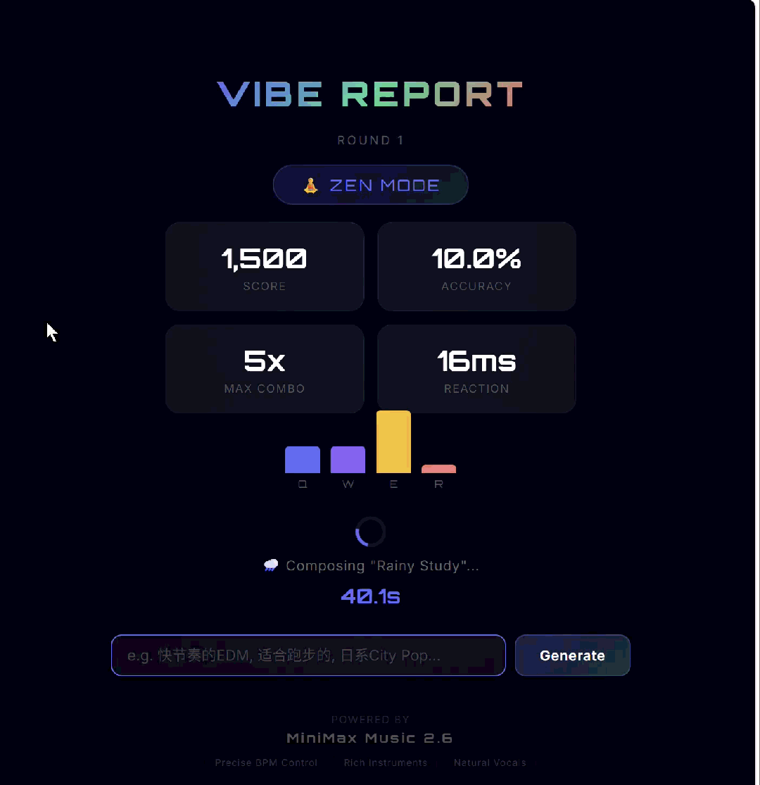 这个游戏有个特别的设计——它接了MiniMax Music 2.6的API。
