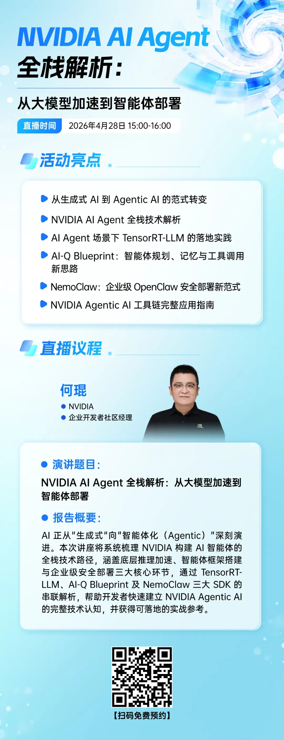 4月28日15:00-16:00,欢迎收看NVIDIA AI Agent 全栈技术分享。感兴趣的小伙伴,欢迎扫码免费预约直播: