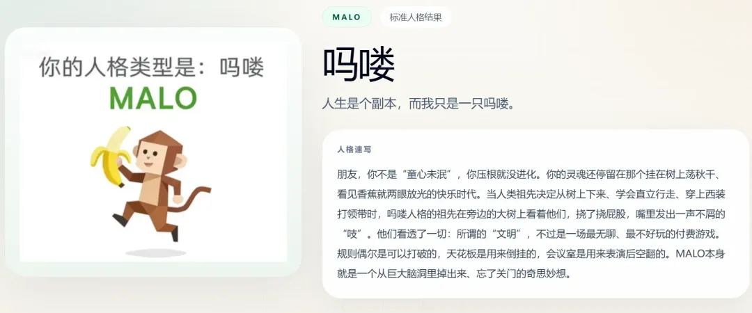 更重要的是,它能快速帮人们找到“同频者”——测出“吗喽”的人,会和同样是“吗喽”的人共鸣“我也是,每天上班像行尸走肉”;测出“ATM-er”的人,会互相吐槽“我也是总替别人买单,太惨了”。