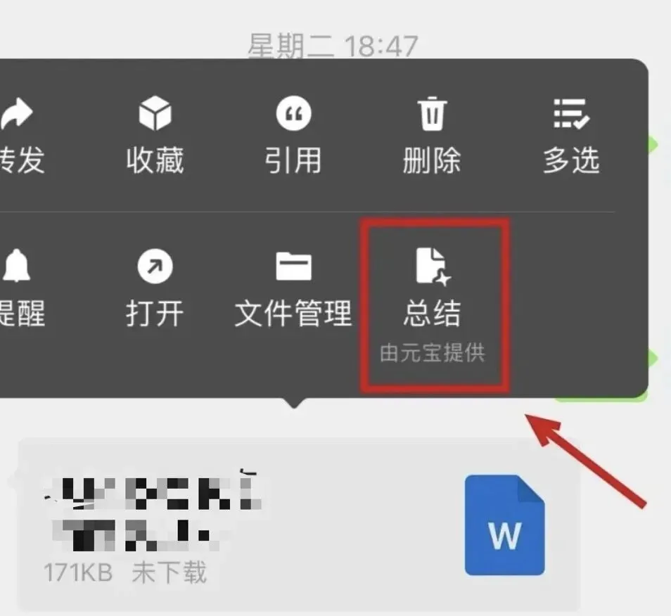 就在最近的更新里,如果你在聊天界面长按文件,会惊喜地发现菜单里多了一个选项——「总结」。
