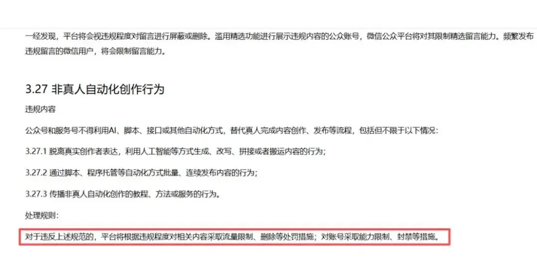 3月27日,微信公众平台即新增“非真人自动化创作行为”的规定,要求公众号和服务号不得利用AI、脚本、接口或其他自动化方式,替代真人完成内容创作、发布等流程,其中包括:脱离真实创作者表达,利用人工智能等方式生成、改写、拼接或者搬运内容的行为;通过脚本、程序托管等自动化方式批量、连续发布内容的行为;传播非真人自动化创作的教程、方法或服务的行为。