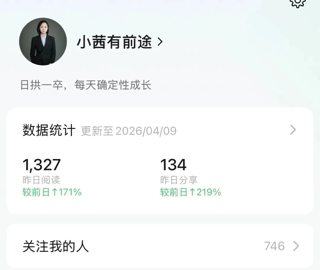 我也从一开始的无人问津,没阅读量,没粉丝,从快写不下去到慢慢写出了大几千、上万阅读量的文章。粉丝也从0涨到了746,也开通了流量主收益。我感觉再写一个月估计就破千了,就像昨天写的那篇帖子,那位死磕AI出海的博主小耳朵,月入4万刀。曾经做抖音,从0粉硬生生做到1000粉,也说过这是一段非常煎熬的历程。