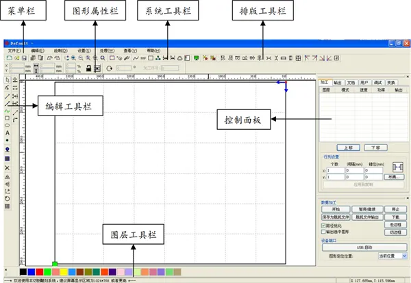 启动软件后即可看到激光加工操作界面,熟悉该界面是软件使用基础,
