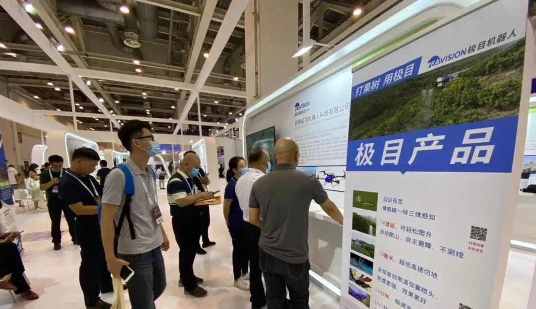 展会现场,极目展位吸引了一大批观众驻足,作为自主型全域智能感知植保无人机,极目现场给观众展示并讲解了无人机的优势及核心技术,“自主避障、双目视觉三维感知、超低仿地、常温弥雾喷洒”等产品功能,得到现场观众一致好评。