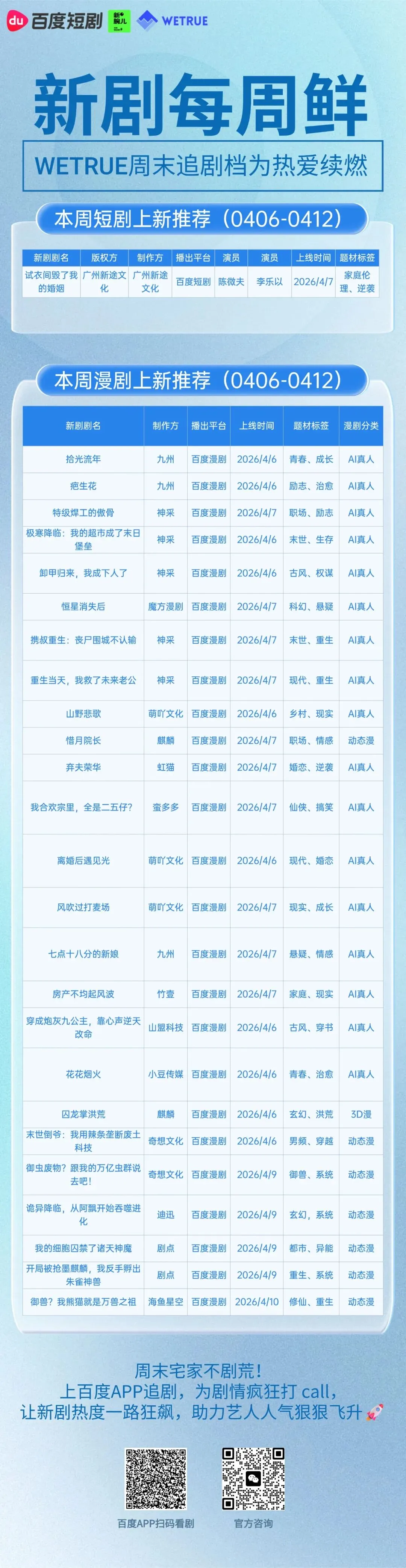 WETRUE新剧每周鲜:周末上百度APP追剧系列(0406-0412)周,漫剧上新清单无论你是需要多接口适配的 AI 开发者、寻求低成本 AI 赋能的中小企业、布局海外的品牌方,还是想抓住 AI 红利的创业伙伴,WETRUE 都能为你定制专属合作方案,多平台接口全覆盖满足你的技术需求,代理商专属优惠降低你的成本投入,让你无障碍享用中国顶级 AI 能力!立即建联,抢占 AI 红利|专属对接通道已开启📌 WETRUE 专属交流群:📌 商务建联方式: