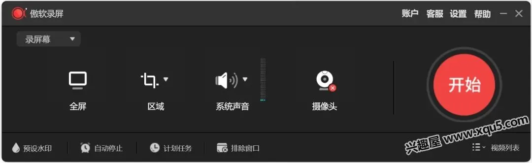 3、多种录屏模式 和 音频录制模式支持 屏幕录制,电脑应用程序窗口录制,摄像头画面录制;支持 电脑系统声音录制,麦克风等外接设备声音录制,支持系统声音和麦克风我声音同时录制,支持不录制声音。