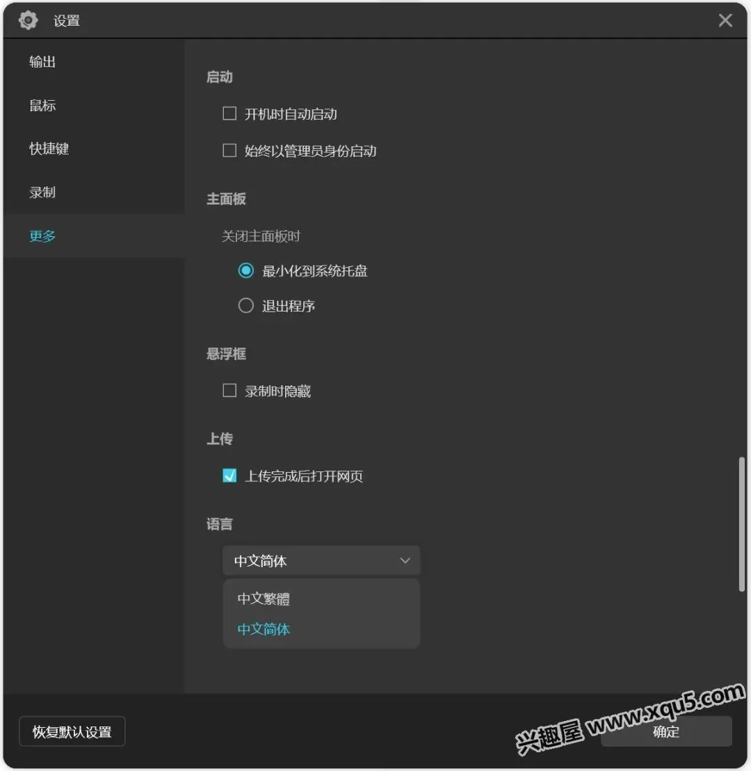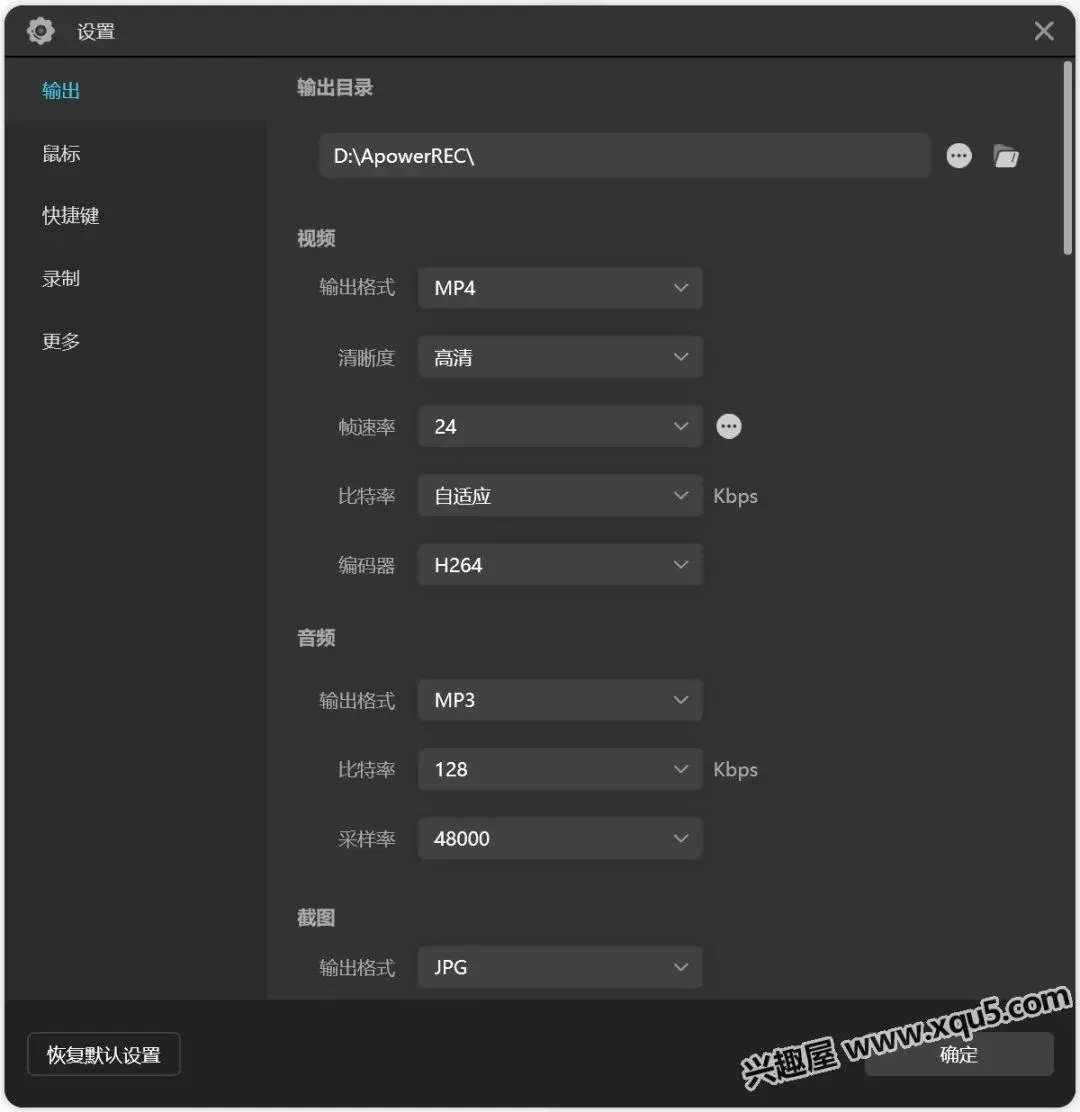 在设置功能中软件还支持自定义设置输出相关参数,录制的鼠标辅助功能,自定义快捷键,录制的参数设置 等。