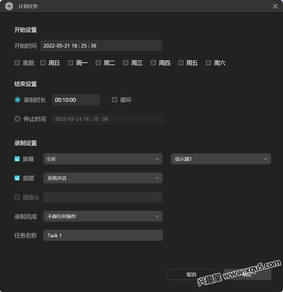 4、支持计划任务 和 定时自动停止功能录屏软件支持设置计划任务,用户可以自定义设置开始的日期、时间,结束的时间,录制时长,是否循环录制,还可以对录制进行设置,如录制的区域,录制的显示器,录制的音频方式,录制完成后,是否进行其他操作等。