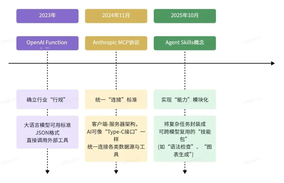 阶段小结:这一阶段,AI代理协议从“一对一适配”的蛮荒时代,迈入了“标准接口 + 即插即用技能”的工业化时代。