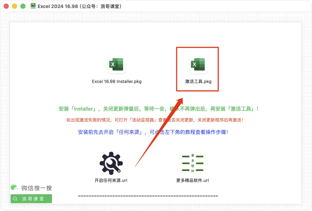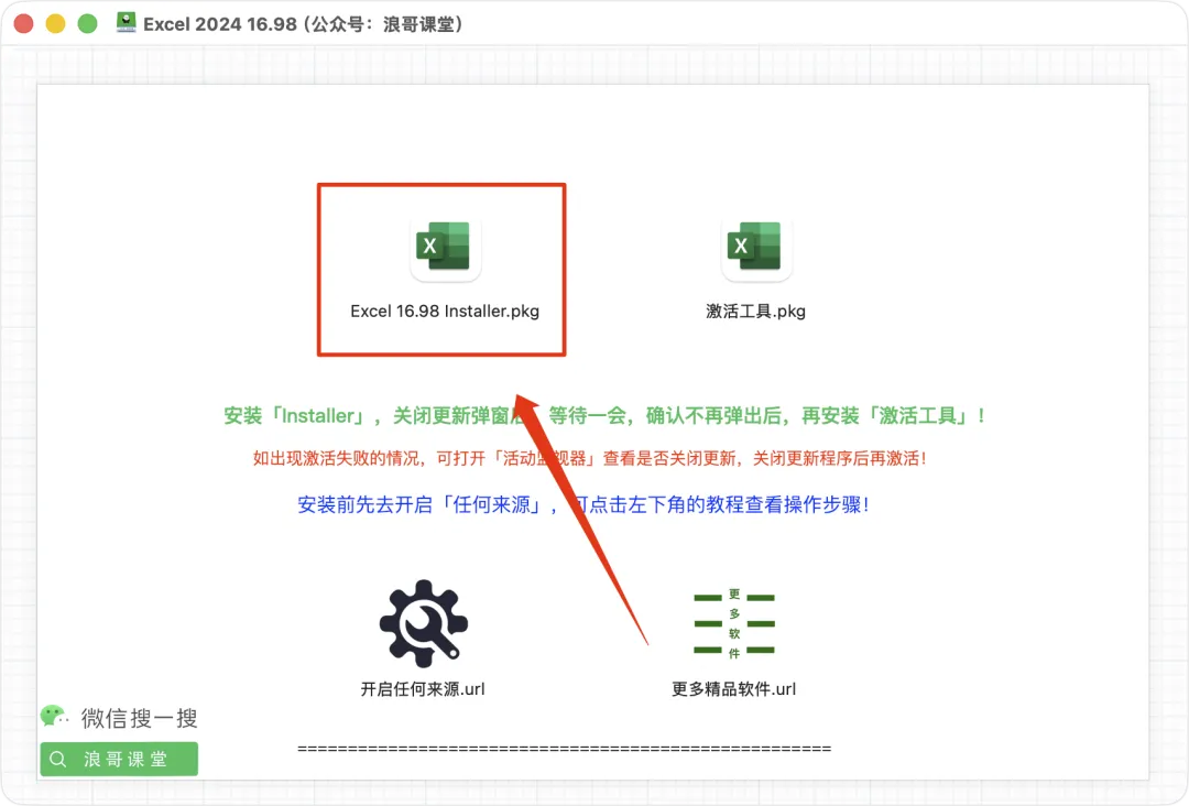 3、打开安装包,然后双击【Excel 16.98 Installer.pkg】安装程序进行安装;