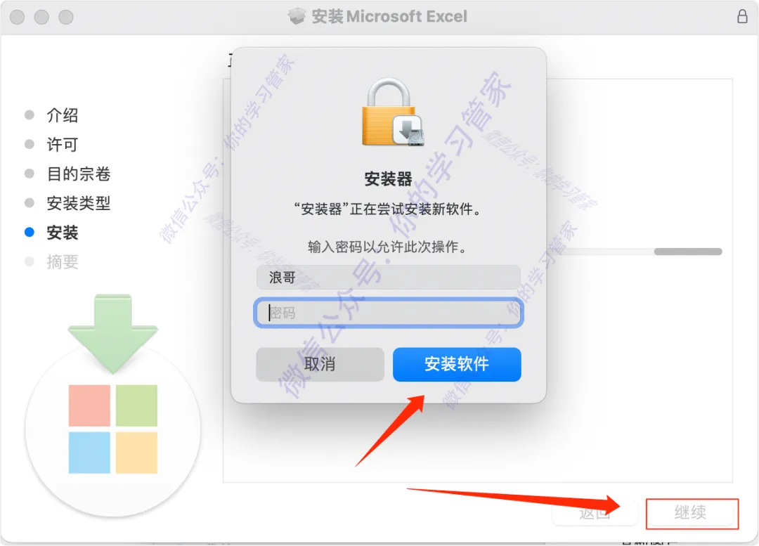 13、然后点击【继续】,输入你的电脑登录密码,然后点击【开始安装】;