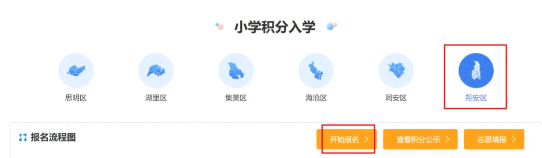2.1点击“积分入学”,页面默认为思明区,请先点选“翔安区”,再点击“开始报名”进入报名。