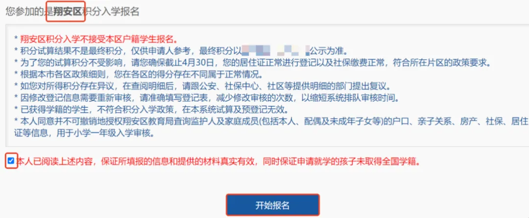 2.2进入“2026年随迁子女小学一年级积分入学网上报名”界面,认真阅读注意事项提醒(蓝色字体部分)。系统默认停留30秒,阅读完勾选下方的方框,确认自己已阅读并同意这些细则,此时下方“开始报名”的按钮由不可点击的灰色变为可以点击的蓝色。点击“开始报名”进入信息登记的界面。