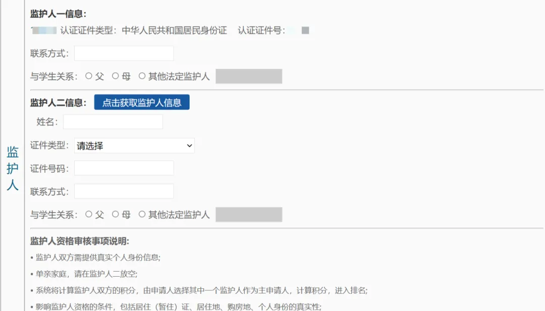 如随迁子女父母双方均在厦暂住、务工、缴交社保则需家长填写正确的监护人二的姓名、身份证号、联系方式,系统会马上针对身份证进行核验。身份校验通过在身份证右边显示绿色的勾。(注:认真阅读底下的资格审核说明,有助于您了解该怎么填写信息。)