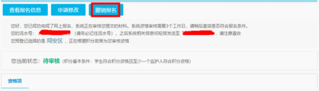 因个人原因,不再参加积分入学,可点击“撤销报名”。