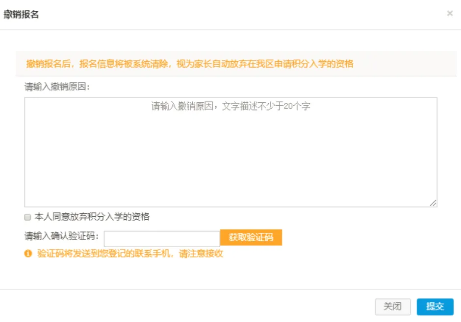 撤销报名需注明撤销原因,填写验证码,方可撤销报名。撤销报名后,即为自愿放弃参加我区2026年积分入学。