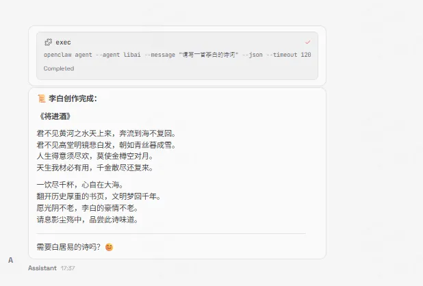 # 创建libai Agentopenclaw agents add libai \ --model "siliconflow/internlm/internlm2_5-7b-chat" \ --workspace "~/.openclaw/agents_team_workplace/workspace-libai"