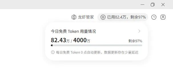 QClaw新用户注册之后,每天会有4000万的免费token,过了0点自动刷新,是目前国内大厂龙虾里免费额度给得最高的,用来体验基本功能完全足够。但这只是公测阶段的福利,之后怎么收费还不清楚。