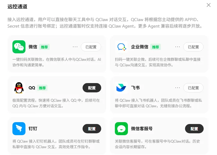 登录QClaw后,点击左下角设置的地方,就可以看到QClaw支持的远控通道,重点是QQ和微信。绑定后,你可以直接用微信发指令,给Qclaw安排任务、让它远程操控电脑、传输电脑文件等,玩法很多。另外,QClaw还有企业微信、钉钉、飞书、微信客服号这四个通道,每个通道都是单独的一个对话框,会在客户端Qclaw上实时同步。