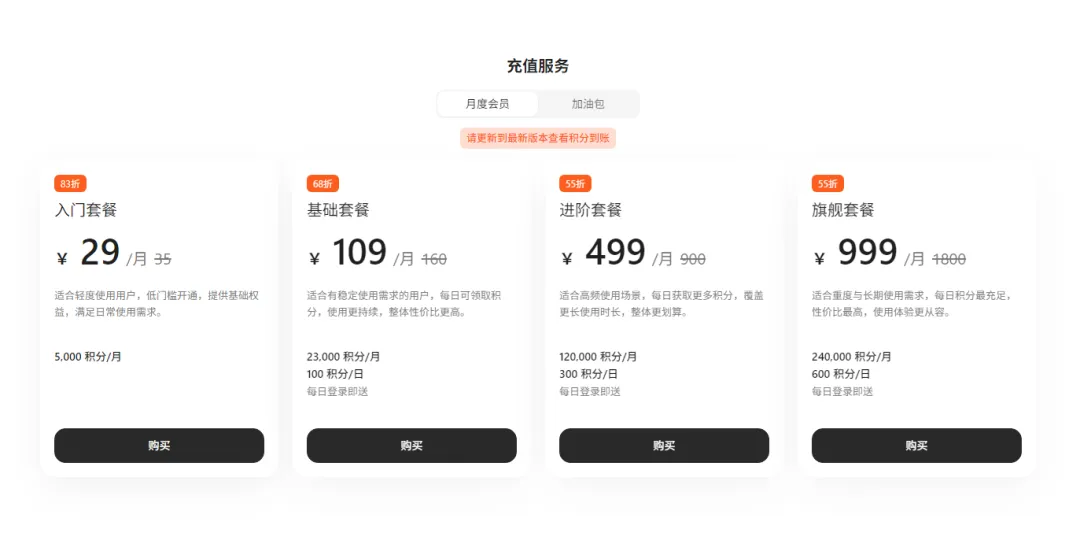 新用户注册AutoClaw会赠送2000-2500的积分,用完后可以选择充值月度会员。入门套餐是29元,每月5000积分,旗舰套餐是999元,每月24万积分,每日登录送600积分,另外还有109-499元的加油包。