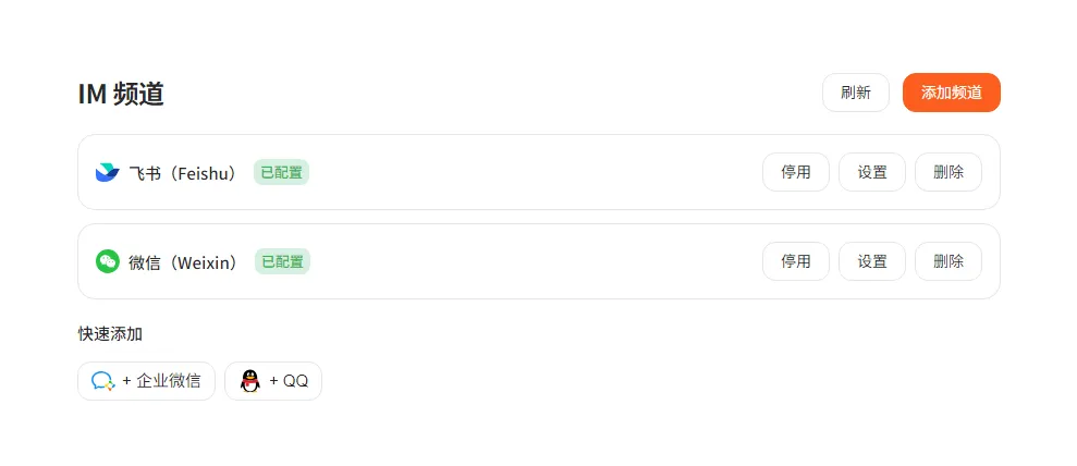 和上面三个龙虾比起来,EasyClaw是接入渠道最全、跨境支持最完善的。它不仅能够接入国内的QQ、微信、飞书、企业微信,还支持Telegram、WhatsApp、Slack等多款海外IM频道。