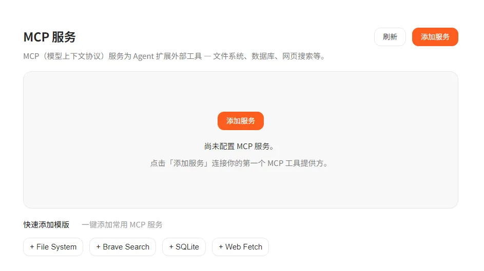 最后补充一点:AutoClaw还提供MCP服务功能。这个功能是什么呢?简单来说,MCP就是Model Context Protocol,模型上下文协议。它允许AutoClaw连接各种外部数据源和工具,让AI的能力进一步扩展。比如说,你可以连接数据库、文件系统、API服务等等,让AI不只是聊天,而是真正成为一个全能助理。