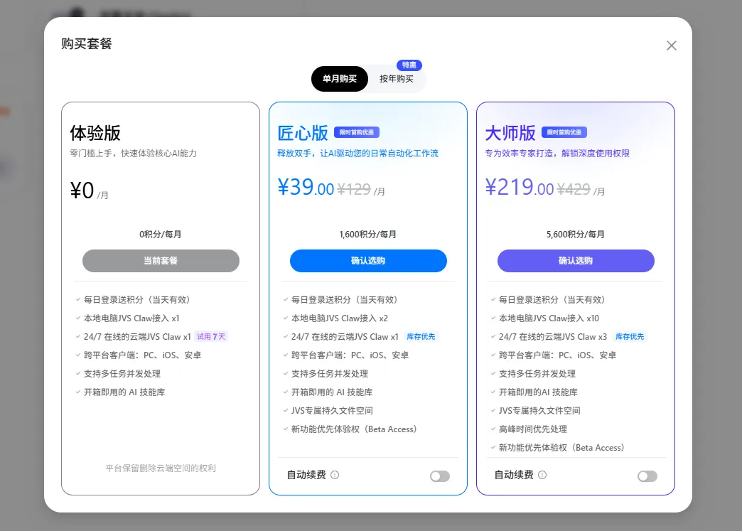 另外,JVS Claw的新用户也赠送免费积分,体验版是200-5000不等的免费活动积分+20个每日赠送积分。升级成匠心版的话,每月有1600个积分,支持接入2个本地电脑JVS Claw以及1个云端Claw。大师版是每月5600个积分,支持本地JVS Claw10个,云端3个,同时解锁团队共享工作区、多成员协同管理等企业级功能,适合小团队办公使用。