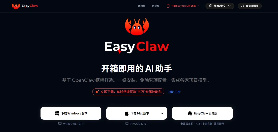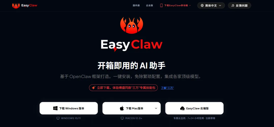 接着,讲讲最后一只龙虾,EasyClaw,也叫“简单龙虾”,它是由猎豹移动推出的,猎豹CEO傅盛亲自验证并发布。EasyClaw的核心定位是把龙虾的使用门槛降到最低,同时它还做了国内独一份的出海场景适配。部署方式支持云端部署、Windows版本地部署、Mac版本地部署、Linux部署,支持iOS、Android移动端远程操控。