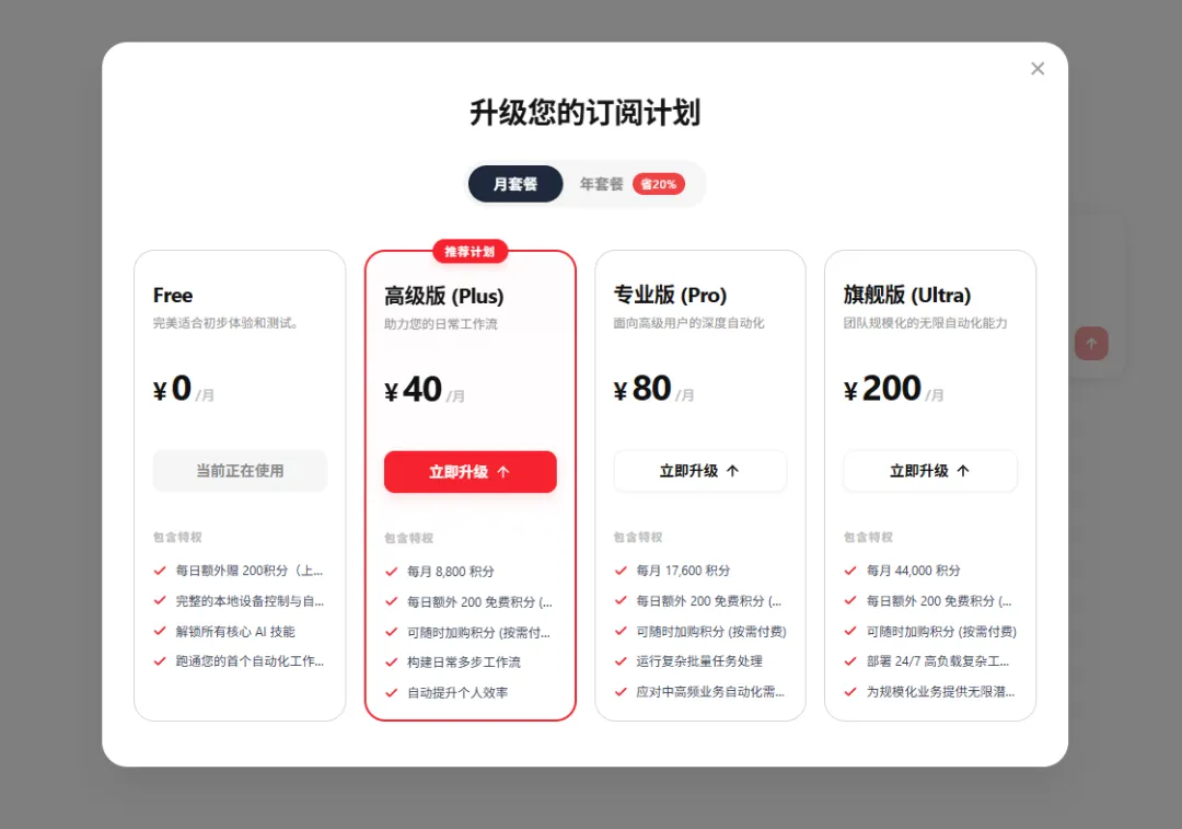 目前,EasyClaw新用户每天有200个免费积分,过了0点自动刷新。升级成Plus版本的话,每月40元,8800个积分。Pro版,每月80元,17600个积分。Ultra版,每月200元,44000个积分。所有套餐的积分都没有使用时间限制,当月用不完可以累计到次月,不会清零。