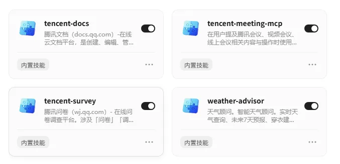 QClaw还支持灵活的技能扩展,内置skill-creator工具,用户可以自行开发自定义技能,并打包成分发包,SkillHub平台也有丰富的社区技能可直接安装。