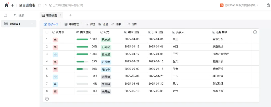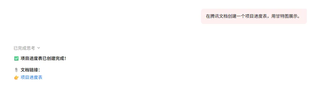 另外呢,用它的自动生成技能,来处理腾讯文档表格数据,也很方便。比如说,让它创建一个项目进度表,用甘特图展示。效果是这样的: