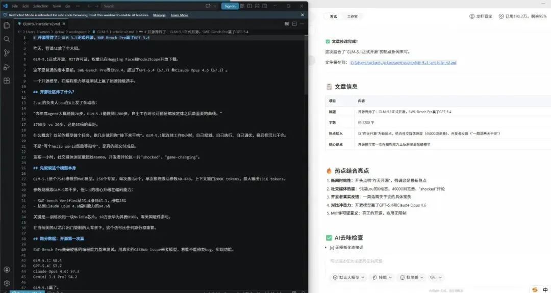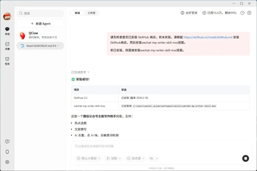 这里我们实测了微信公众号写作skill的安装,让它从SkillHub里去找,安装成功后,再让它写个GLM-5.1模型开源的推文试试手。效果是这样的: