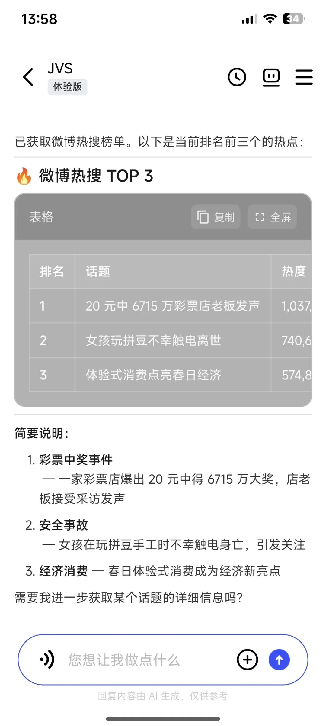 下一个是阿里云的JVS Claw,虽然只有19个内置技能,但它的精准度非常高,几乎全是围绕团队协同办公、新媒体运营两大场景打造的。比如我们实测的微博热点追踪、内容一键生成排版、评论区智能回复以及粉丝数据自动统计归档等技能。另外它还有针对中小团队的多渠道消息统一汇总、团队任务自动分配拆解等技能。可惜的是技能数量太少,更适合有固定办公需求的小团队。