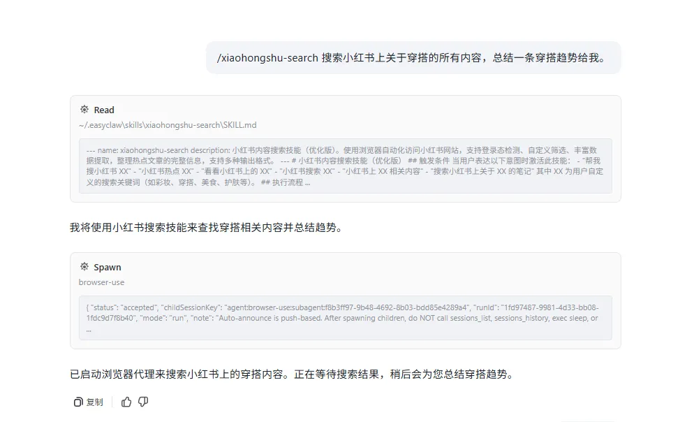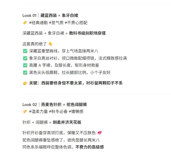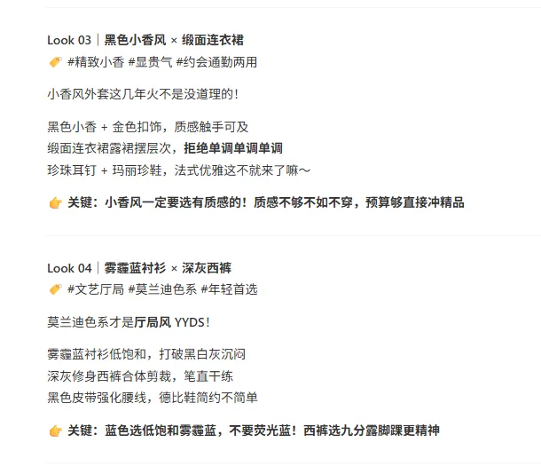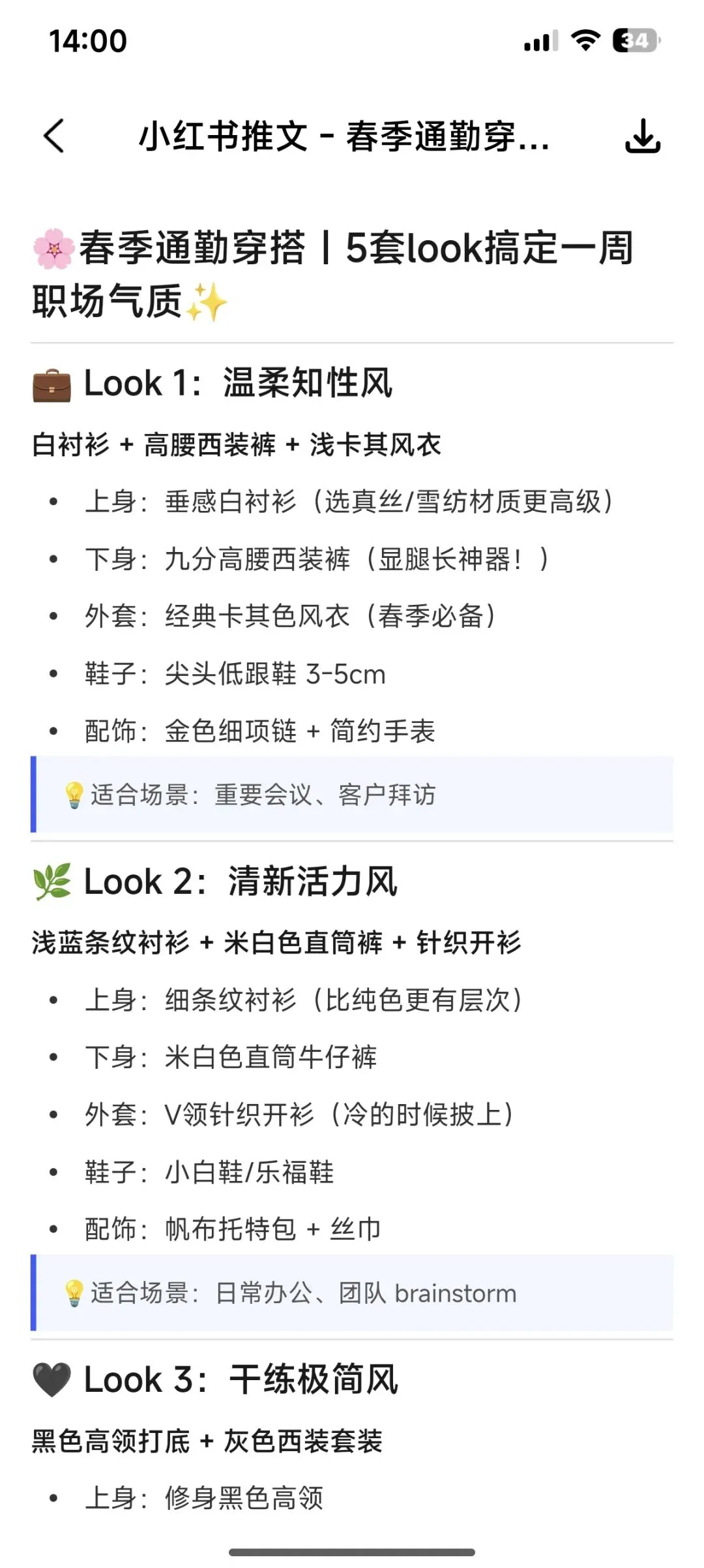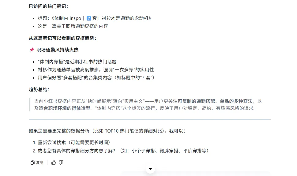 这里我给大家演示一个小红书笔记全流程创作的技能:先让它搜索小红书上关于穿搭的所有内容,总结一条穿搭趋势出来。这里它找到的关键标签是“体制内穿搭”,接着让它根据这个标签,对应生成一条推文。效果是这样的: