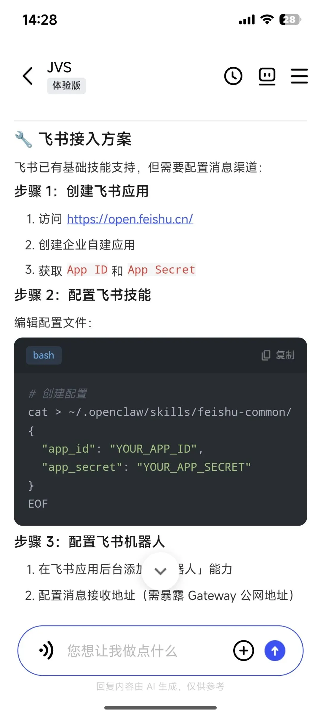 IM频道这块,JVS Claw 是四款产品里接入渠道最丰富的,除了常规的QQ、企业微信、钉钉、飞书,它还支持接入微博。接入操作也很简单,只需要在微博移动端关注并私信微博龙虾助手,发送指令 “连接龙虾”,复制助手返回的App ID和App Secret,进入JVS Claw后台粘贴就能完成绑定。
