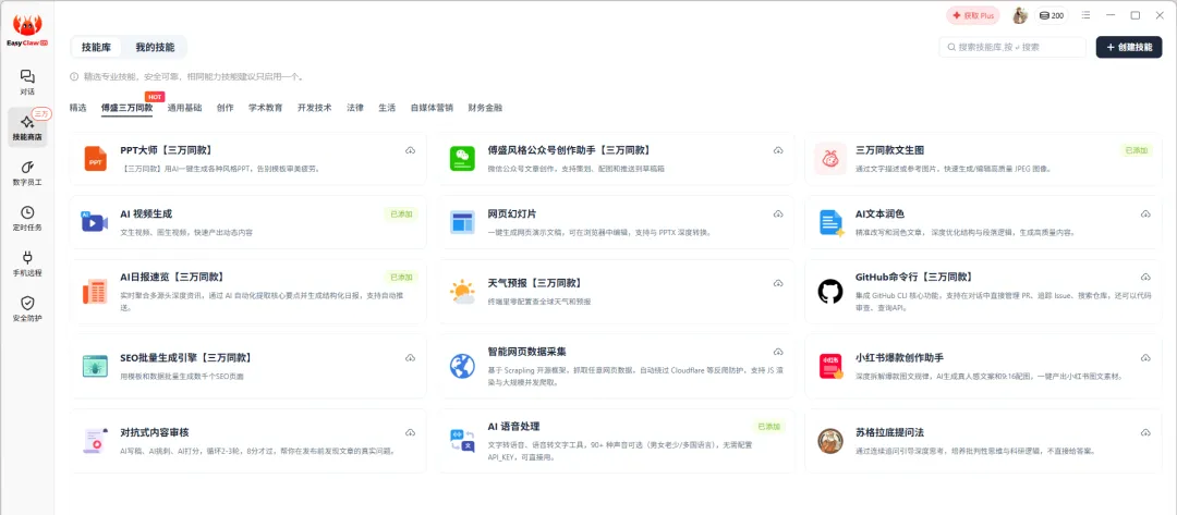 最后就是技能数量断层领先的EasyClaw,101个内置技能,其中有15个傅盛专属技能,包括微信公众号创作、小红书创作等,再加上开放的全中文技能市场,不管是内置技能还是市场里的第三方技能,都能秒下载秒加载。
