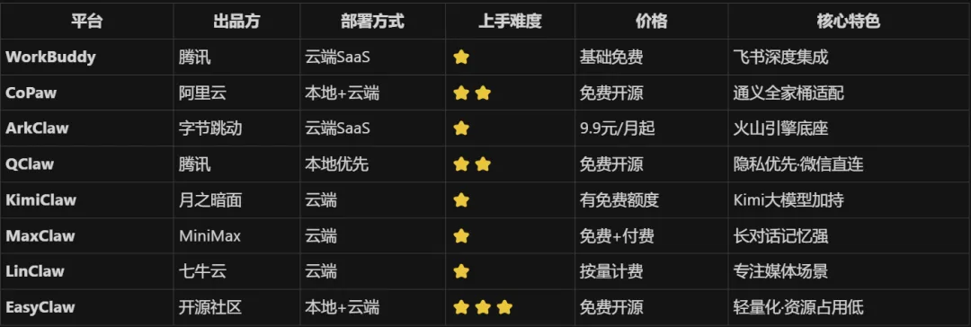 第四弹:国内openclaw定制平台横评|小白选哪个,看完就懂了2026年,AI智能体彻底爆发。OpenCLAW(粉丝叫它"龙虾")是全球最火的开源智能体框架——能帮你操控电脑、发邮件、搜资料、24小时待命。但原生版是给极客用的,全英文、要折腾命令行,门槛不低。于是各大厂纷纷出手,推出了各自的国产"改版"——上手简单、中文友好、接地气。今天我们就来盘一盘,国内最主流的8个平台,帮你找到最适合你的那个。---------------------------------------------------------------一张表看懂全局逐个认识主流平台🟢 WorkBuddy 出品方:腾讯 | 适合人群:飞书用户、想快速用起来的人腾讯出品,定位就是"让普通人也能用上龙虾"。深度集成飞书,有图形界面,不用敲代码,对已在用飞书办公的人非常顺滑。支持多技能插件扩展。✅ 开箱即用、飞书集成优秀、腾讯生态加持 ❌ 功能相对封闭,定制化空间有限🟡 CoPaw 出品方:阿里云(通义实验室)| 适合人群:想同时用通义全家桶的人阿里通义实验室基于AgentScope框架开发,特点是"本地+云端双模式"都能跑。能对接通义各种能力(通义千问、通义万相),长对话记忆做得不错。2026年2月刚开源,部分功能仍在完善。✅ 长记忆能力强、阿里生态免费开源 ❌ 刚开源不久,部分功能还在完善🟢 ArkClaw 出品方:字节跳动(火山引擎)| 适合人群:企业用户、飞书深度用户字节跳动云端SaaS版,号称"5分钟就能上手"。依托火山引擎,有比较好的稳定性。支持飞书接入,适合企业搭建智能工作流。9.9元/月起,有免费试用。✅ 部署极快、企业级稳定、飞书深度集成 ❌ 付费产品,完全依赖云端🟡 QClaw 出品方:腾讯 | 适合人群:重视隐私、想接入微信的人和WorkBuddy是"亲兄弟",但QClaw走的是"隐私优先"路线——数据留在本地,不上传云端。支持微信接入(这是很多国内用户的刚需)。本地部署优先,云端辅助。有24小时心跳调度器。✅ 隐私可控、微信直连、完全开源免费 ❌ 本地部署有一定门槛,微信接入需要折腾🟢 KimiClaw 出品方:月之暗面 | 适合人群:想用Kimi大模型、日常轻度使用的用户Kimi家的云端封装版,接入Kimi大模型,对话体验比较好。适合不想折腾、只想有个AI助手打下手的人。注册就能用,没有复杂配置。✅ 体验流畅、零配置、有免费额度 ❌ 云端依赖,深度定制能力弱🟢 MaxClaw 出品方:MiniMax | 适合人群:需要长对话、复杂任务处理的用户MiniMax出的云端版OpenCLAW,主打长对话记忆和复杂任务理解能力。如果你的工作需要AI处理长文档、连续多步操作,MaxClaw表现会比较稳。✅ 长记忆强、复杂任务理解好 ❌ 深度使用有一定成本🔵 LinClaw 出品方:七牛云 | 适合人群:做媒体/内容相关工作的人七牛云出的版本,专注媒体场景(图片、视频、音频处理)。如果你用OpenCLAW来处理内容创作,LinClaw的媒体能力集成得比较好。按量计费,灵活度高。✅ 媒体处理有优化、按量计费灵活 ❌ 受众较窄,非媒体场景优势不明显⚪ EasyClaw 出品方:开源社区 | 适合人群:有技术背景、追求轻量化的用户社区驱动的轻量版,资源占用低,适合老机器或服务器。如果你不想要大厂产品,喜欢折腾开源透明,EasyClaw是个干净的选择。✅ 轻量、开源透明、无大厂依赖 ❌ 上手有门槛,需一定技术基础-------------------------------------------------------------------怎么选?对号入座🙋 我是小白,只想快点用起来 → WorkBuddy 或 KimiClaw🏢 我用飞书办公,想要企业级稳定 → ArkClaw🔒 我想用微信接入,隐私要可控 → QClaw🐱 我想同时用通义的工具 → CoPaw🧠 我需要处理长对话、复杂任务 → MaxClaw⚙️ 我是技术人员,喜欢开源透明 → EasyClaw🎬 我做媒体内容工作 → LinClaw---------------------------------------------------------------------写在最后说实话,每个平台都在快速迭代,今天的缺点可能下个月就补上了。最重要的不是你选了哪个,而是你开始用。选一个顺眼的先用起来,遇到问题解决不了,来找我,我帮你查。养虾嘛,都是这么过来的 🦞📌 下一期预告 《OpenCLAW报错排查手册——90%的人都会遇到的这些问题》 养虾路上最常踩的坑,我帮你提前排掉。