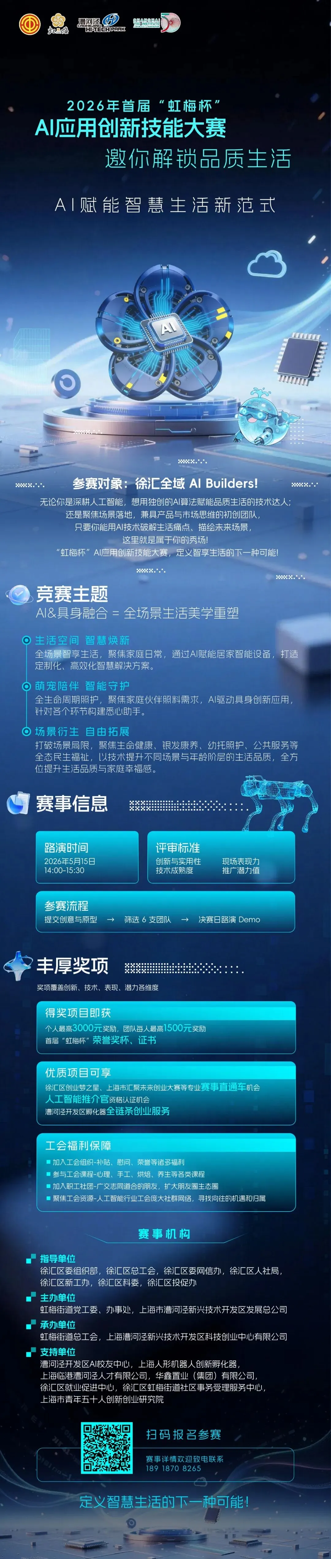 近日,2026年首届“虹梅杯”AI应用创新技能大赛已启动,丰厚奖励静待AI领域英才前来角逐,为AI垂类应用搭建展示平台,为初创团队搭建技能展露舞台,为徐汇创新创业生态营造积极氛围。