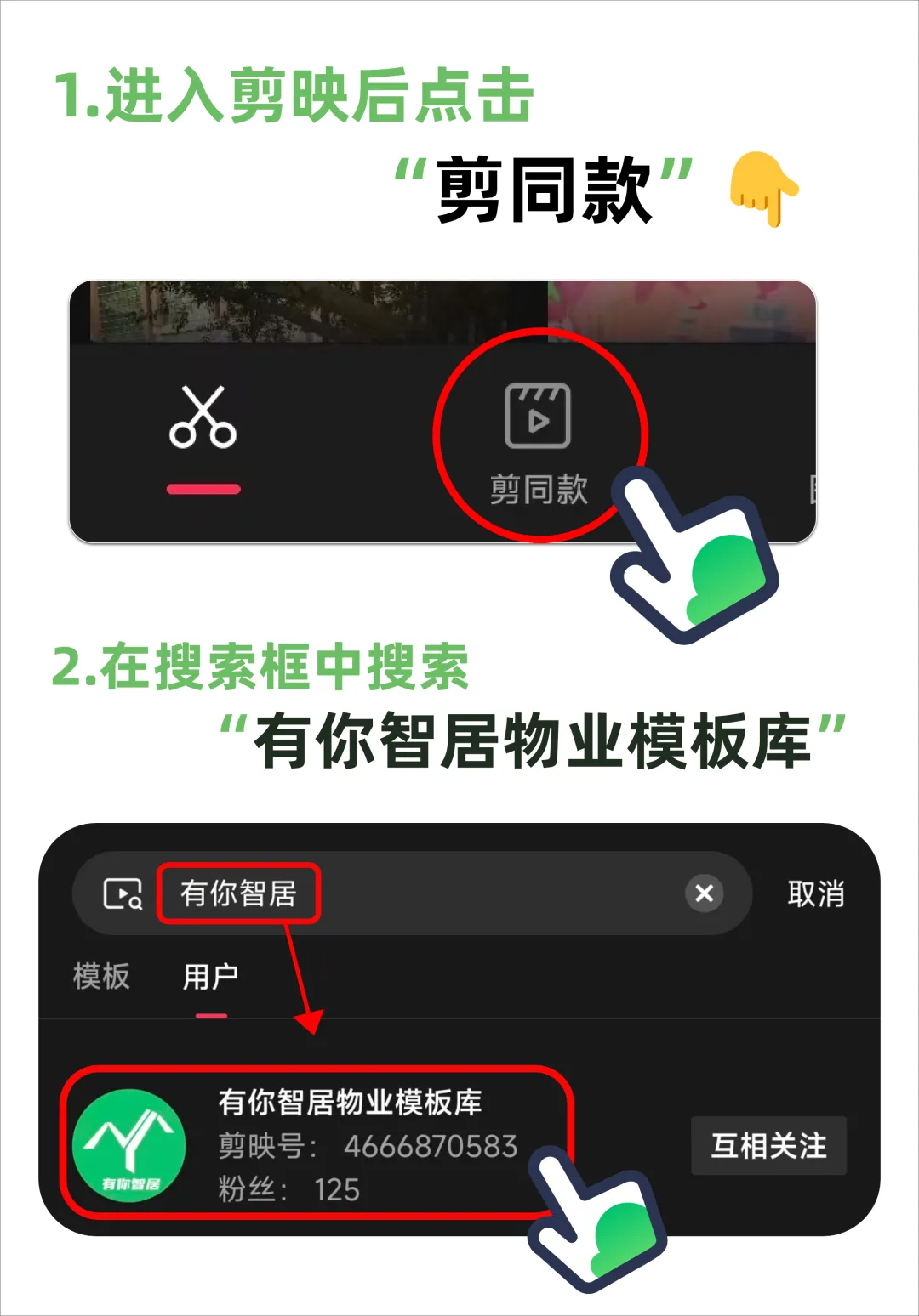 在应用市场下载并打开剪映APP,找到剪同款,在搜索框搜索:有你智居物业模板库