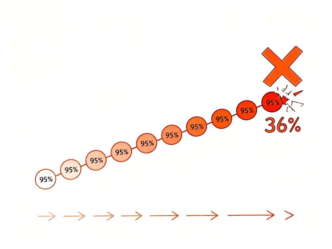 这里有一个关键的数学问题:假设一个复杂任务需要20个步骤,AI每一步的成功率是95%(这已经很高了)。但在没有外部管理系统的情况下,整个任务从头到尾做对的概率,只有95%的20次方,算下来大约是36%。