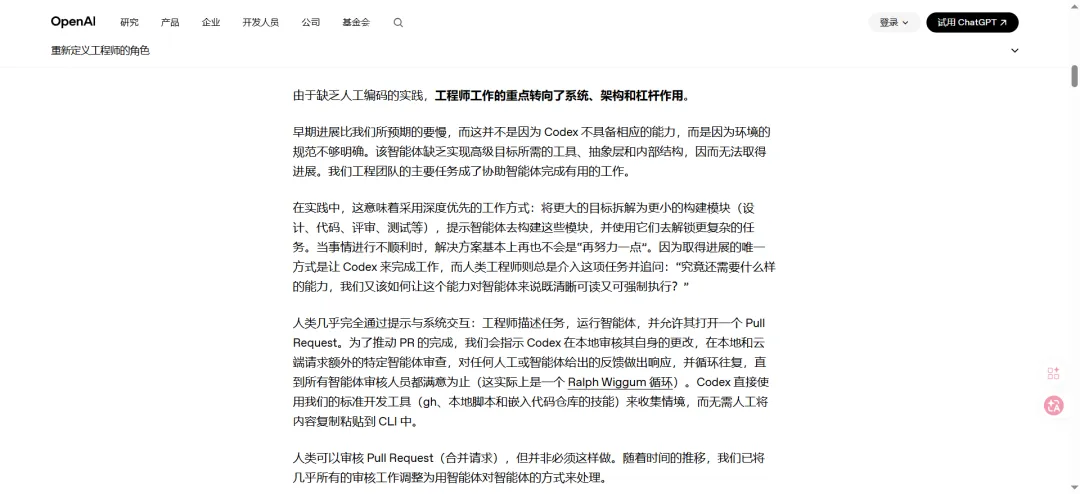 OpenAI甚至让几个人组成的团队,用这套方法从零构建了超过100万行代码的产品。人类不写代码,只负责设计这套规则。当AI出错时,人类不是去改提示词,而是问“规则里缺了什么”,然后补上规则,让AI自己修复。