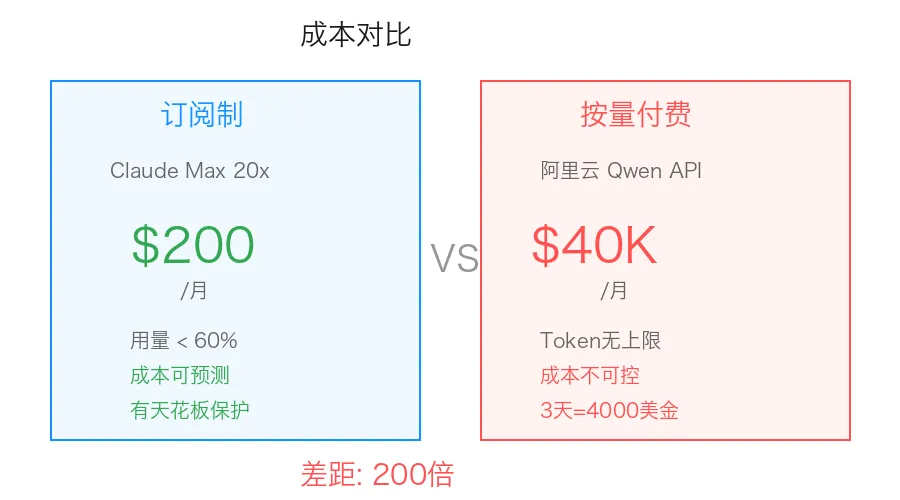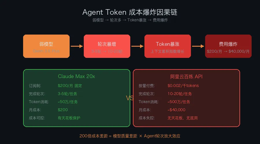 注意,这不是"Claude更贵所以更好"的故事。恰恰相反——Claude的订阅制在Agent场景下是巨大的补贴,而阿里云的按量付费+弱模型组合,反而成了最贵的选择。
