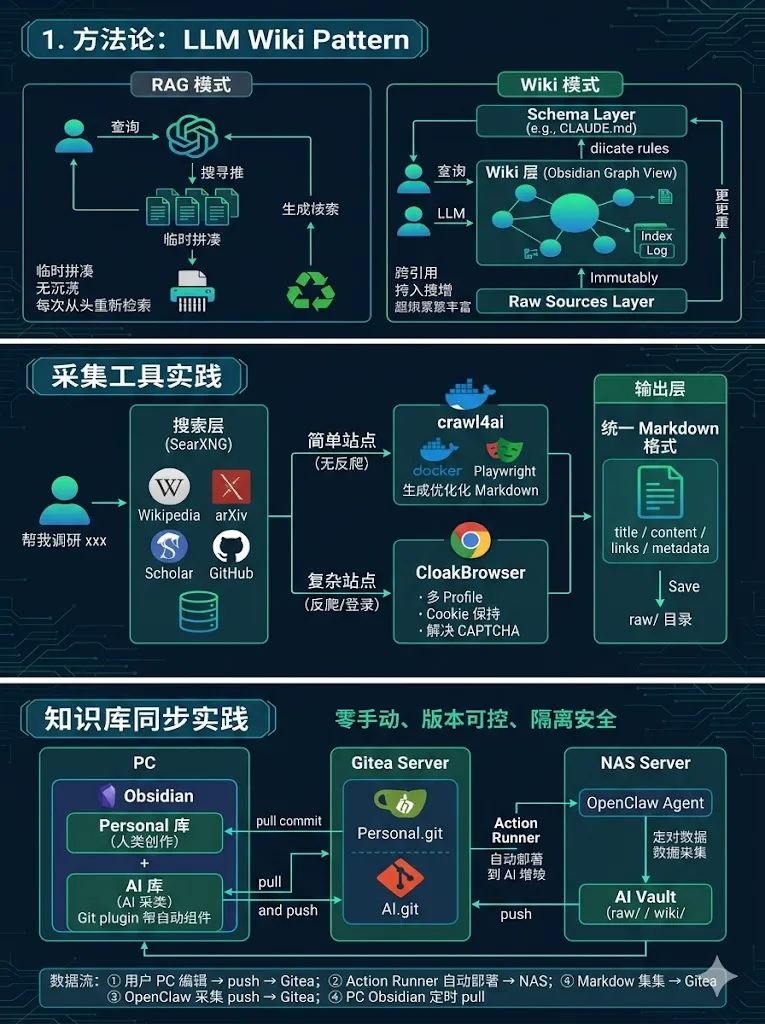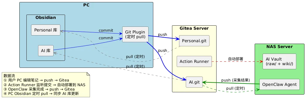 OpenClaw 运行在 NAS 上 执行采集任务后,写入 AI 库的 raw/ 和 wiki/ 完成后 push 到 Gitea 本地 Obsidian 同步